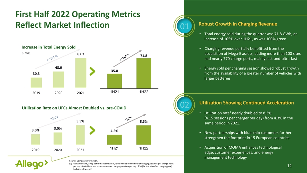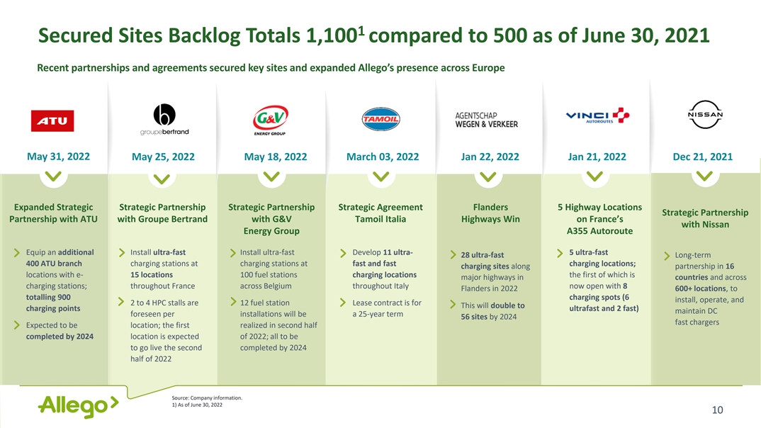 1 Secured Sites Backlog Totals 1,100 compared to 500 as of June 30, 2021 Recent partnerships and agreements secured key sites and expanded Allego’s presence across Europe May 31, 2022 May 25, 2022 May 18, 2022 March 03, 2022 Jan 22, 2022 Jan 21, 2022 Dec 21, 2021 Expanded Strategic Strategic Partnership Strategic Partnership Strategic Agreement Flanders 5 Highway Locations Strategic Partnership Partnership with ATU with Groupe Bertrand with G&V Tamoil Italia Highways Win on France’s with Nissan Energy Group A355 Autoroute Equip an additional Install ultra-fast Install ultra-fast Develop 11 ultra- 5 ultra-fast 28 ultra-fast Long-term 400 ATU branch charging stations at charging stations at fast and fast charging locations; charging sites along partnership in 16 locations with e- 15 locations 100 fuel stations charging locations the first of which is major highways in countries and across charging stations; throughout France across Belgium throughout Italy now open with 8 Flanders in 2022 600+ locations, to totalling 900 charging spots (6 install, operate, and 2 to 4 HPC stalls are 12 fuel station Lease contract is for This will double to charging points ultrafast and 2 fast) maintain DC foreseen per installations will be a 25-year term 56 sites by 2024 fast chargers Expected to be location; the first realized in second half completed by 2024 location is expected of 2022; all to be to go live the second completed by 2024 half of 2022 Source: Company information. 1) As of June 30, 2022 10