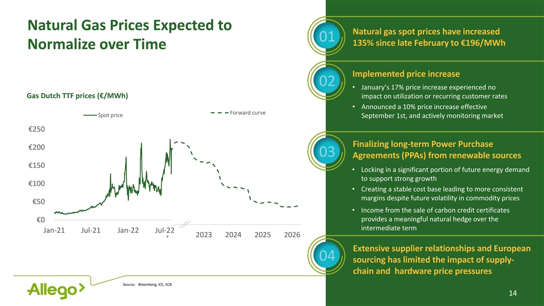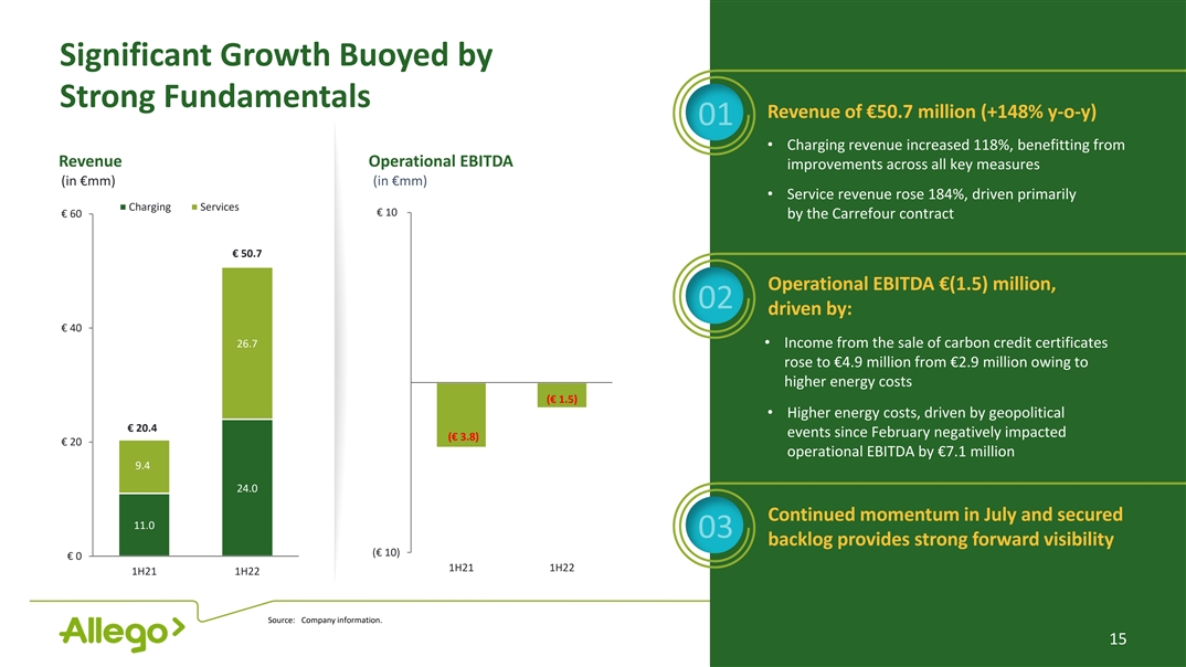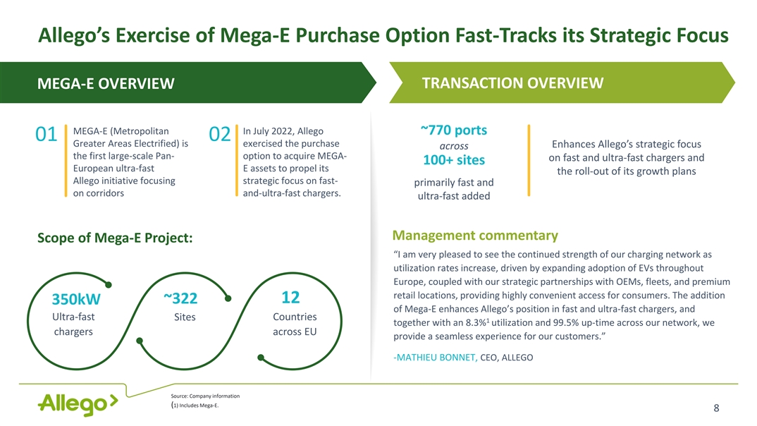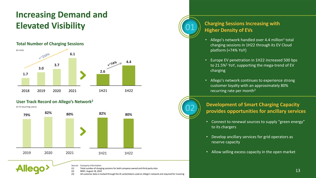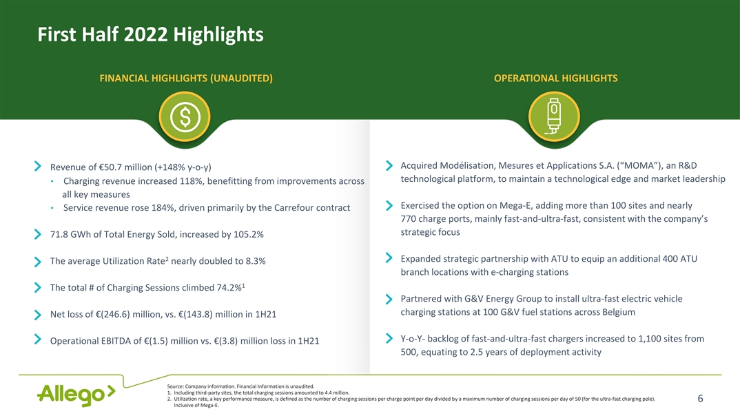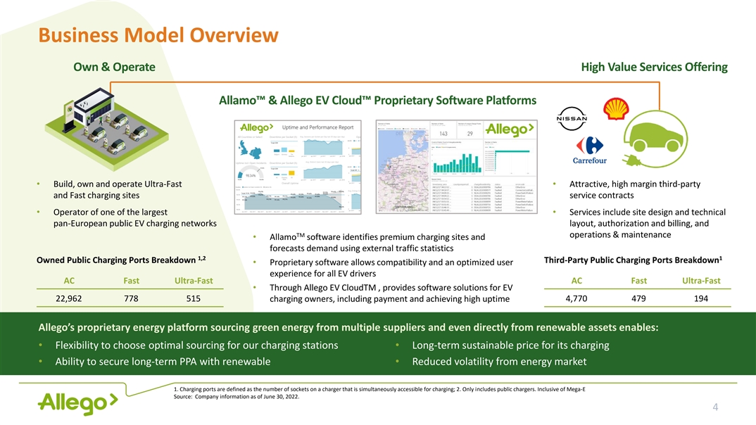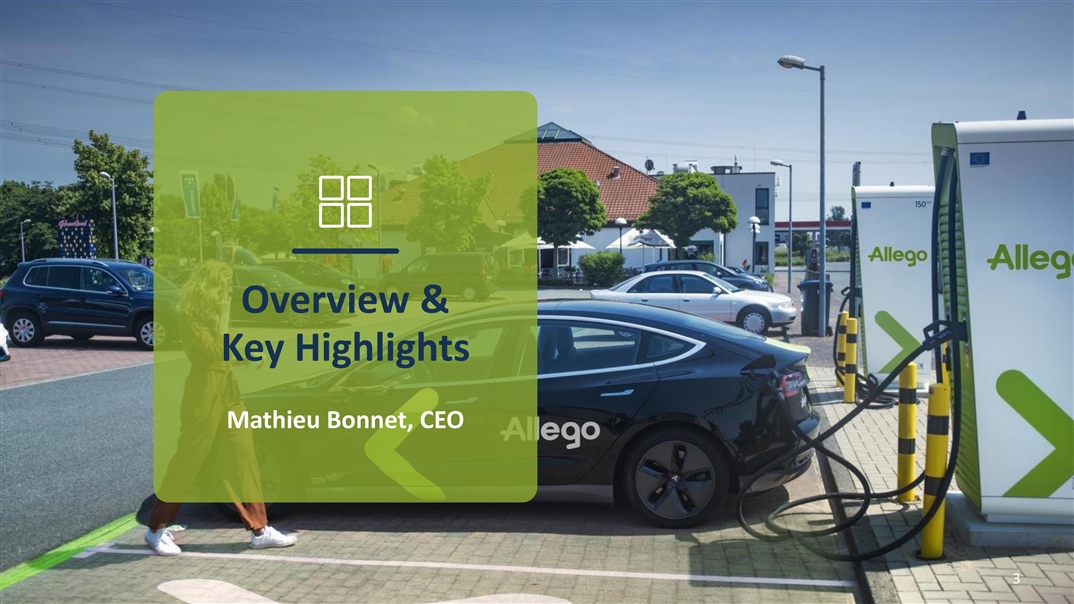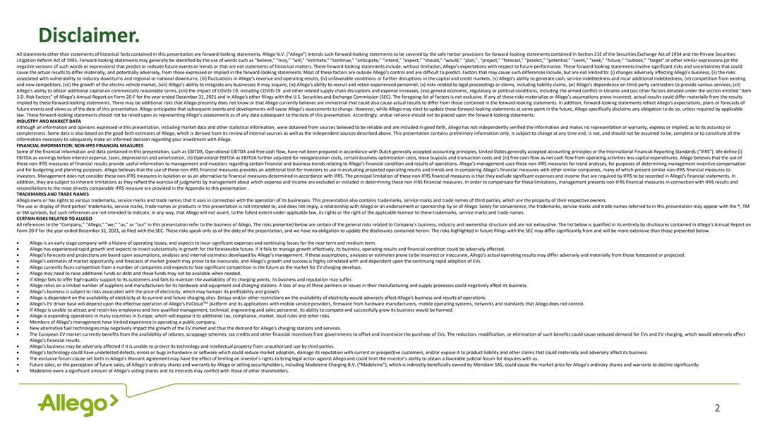 Disclaimer. All statements other than statements of historical facts contained in this presentation are forward-looking statements. Allego N.V. (“Allego”) intends such forward-looking statements to be covered by the safe harbor provisions for forward-looking statements contained in Section 21E of the Securities Exchange Act of 1934 and the Private Securities Litigation Reform Act of 1995. Forward-looking statements may generally be identified by the use of words such as “believe,” “may,” “will,” “estimate,” “continue,” “anticipate,” “intend,” “expect,” “should,” “would,” “plan,”, “project,” “forecast,” “predict,” “potential,” “seem,” “seek,” “future,” “outlook,” “target” or other similar expressions (or the negative versions of such words or expressions) that predict or indicate future events or trends or that are not statements of historical matters. These forward-looking statements include, without limitation, Allego’s expectations with respect to future performance. These forward-looking statements involve significant risks and uncertainties that could cause the actual results to differ materially, and potentially adversely, from those expressed or implied in the forward-looking statements. Most of these factors are outside Allego’s control and are difficult to predict. Factors that may cause such differences include, but are not limited to: (i) changes adversely affecting Allego’s business, (ii) the risks associated with vulnerability to industry downturns and regional or national downturns, (iii) fluctuations in Allego’s revenue and operating results, (iv) unfavorable conditions or further disruptions in the capital and credit markets, (v) Allego’s ability to generate cash, service indebtedness and incur additional indebtedness, (vi) competition from existing and new competitors, (vii) the growth of the electric vehicle market, (viii) Allego’s ability to integrate any businesses it may acquire, (ix) Allego’s ability to recruit and retain experienced personnel, (x) risks related to legal proceedings or claims, including liability claims, (xi) Allego’s dependence on third-party contractors to provide various services, (xii) Allego’s ability to obtain additional capital on commercially reasonable terms, (xiii) the impact of COVID-19, including COVID-19 and other related supply chain disruptions and expense increases, (xiv) general economic, regulatory or political conditions, including the armed conflict in Ukraine and (xv) other factors detailed under the section entitled “Item 3.D. Risk Factors” of Allego’s Annual Report on Form 20-F for the year ended December 31, 2021 and in Allego’s other filings with the U.S. Securities and Exchange Commission (SEC). The foregoing list of factors is not exclusive. If any of these risks materialize or Allego’s assumptions prove incorrect, actual results could differ materially from the results implied by these forward-looking statements. There may be additional risks that Allego presently does not know or that Allego currently believes are immaterial that could also cause actual results to differ from those contained in the forward-looking statements. In addition, forward-looking statements reflect Allego’s expectations, plans or forecasts of future events and views as of the date of this presentation. Allego anticipates that subsequent events and developments will cause Allego’s assessments to change. However, while Allego may elect to update these forward-looking statements at some point in the future, Allego specifically disclaims any obligation to do so, unless required by applicable law. These forward-looking statements should not be relied upon as representing Allego’s assessments as of any date subsequent to the date of this presentation. Accordingly, undue reliance should not be placed upon the forward-looking statements. INDUSTRY AND MARKET DATA Although all information and opinions expressed in this presentation, including market data and other statistical information, were obtained from sources believed to be reliable and are included in good faith, Allego has not independently verified the information and makes no representation or warranty, express or implied, as to its accuracy or completeness. Some data is also based on the good faith estimates of Allego, which is derived from its review of internal sources as well as the independent sources described above. This presentation contains preliminary information only, is subject to change at any time and, is not, and should not be assumed to be, complete or to constitute all the information necessary to adequately make an informed decision regarding your investment with Allego. FINANCIAL INFORMATION; NON-IFRS FINANCIAL MEASURES Some of the financial information and data contained in this presentation, such as EBITDA, Operational EBITDA and free cash flow, have not been prepared in accordance with Dutch generally accepted accounting principles, United States generally accepted accounting principles or the International Financial Reporting Standards (“IFRS”). We define (i) EBITDA as earnings before interest expense, taxes, depreciation and amortization, (ii) Operational EBITDA as EBITDA further adjusted for reorganization costs, certain business optimization costs, lease buyouts and transaction costs and (iii) free cash flow as net cash flow from operating activities less capital expenditures. Allego believes that the use of these non-IFRS measures of financial results provide useful information to management and investors regarding certain financial and business trends relating to Allego’s financial condition and results of operations. Allego’s management uses these non-IFRS measures for trend analyses, for purposes of determining management incentive compensation and for budgeting and planning purposes. Allego believes that the use of these non-IFRS financial mea