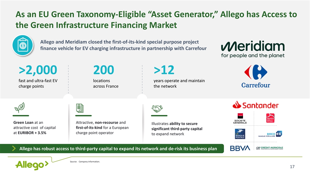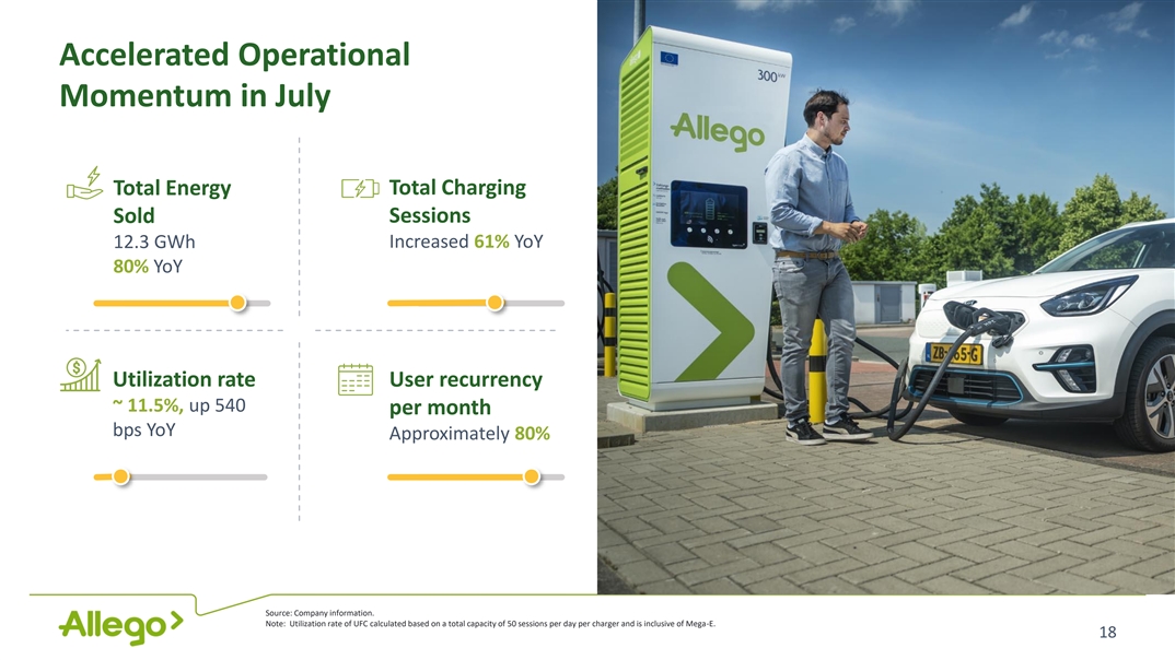 As an EU Green Taxonomy-Eligible “Asset Generator,” Allego has Access to the Green Infrastructure Financing Market Allego and Meridiam closed the first-of-its-kind special purpose project finance vehicle for EV charging infrastructure in partnership with Carrefour >2,000 200 >12 fast and ultra-fast EV locations years operate and maintain charge points across France the network Green Loan at an Attractive, non-recourse and Illustrates ability to secure attractive cost of capital first-of-its-kind for a European significant third-party capital at EURIBOR + 3.5% charge point operator to expand network Allego has robust access to third-party capital to expand its network and de-risk its business plan Source: Company information. 17