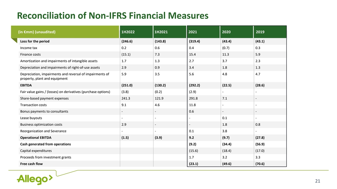 Reconciliation of Non-IFRS Financial Measures (in €mm) (unaudited) 1H2022 1H2021 2021 2020 2019 Loss for the period (246.6) (143.8) (319.4) (43.4) (43.1) Income tax 0.2 0.6 0.4 (0.7) 0.3 Finance costs (15.1) 7.3 15.4 11.3 5.9 Amortization and impairments of intangible assets 1.7 1.3 2.7 3.7 2.3 Depreciation and impairments of right-of-use assets 2.9 0.9 3.4 1.8 1.3 Depreciation, impairments and reversal of impairments of 5.9 3.5 5.6 4.8 4.7 property, plant and equipment EBITDA (251.0) (130.2) (292.2) (22.5) (28.6) Fair value gains / (losses) on derivatives (purchase options) (3.8) (0.2) (2.9) - - Share-based payment expenses 241.3 121.9 291.8 7.1 - Transaction costs 9.1 4.6 11.8 - - Bonus payments to consultants - - 0.6 - - Lease buyouts - - - 0.1 - Business optimization costs 2.9 - - 1.8 0.8 Reorganization and Severance - - 0.1 3.8 - Operational EBITDA (1.5) (3.9) 9.2 (9.7) (27.8) Cash generated from operations (9.2) (34.4) (56.9) Capital expenditures (15.6) (18.4) (17.0) Proceeds from investment grants 1.7 3.2 3.3 Free cash flow (23.1) (49.6) (70.6) 21