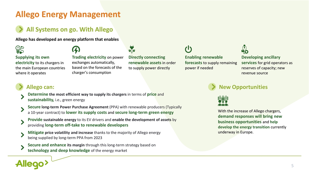 Business Model Overview Own & Operate High Value Services Offering Allamo™ & Allego EV Cloud™ Proprietary Software Platforms • Build, own and operate Ultra-Fast • Attractive, high margin third-party and Fast charging sites service contracts • Operator of one of the largest • Services include site design and technical pan-European public EV charging networks layout, authorization and billing, and TM operations & maintenance • Allamo software identifies premium charging sites and forecasts demand using external traffic statistics 1,2 1 Owned Public Charging Ports Breakdown Third-Party Public Charging Ports Breakdown • Proprietary software allows compatibility and an optimized user experience for all EV drivers AC Fast Ultra-Fast AC Fast Ultra-Fast • Through Allego EV CloudTM , provides software solutions for EV 22,962 778 515 4,770 479 194 charging owners, including payment and achieving high uptime Allego’s proprietary energy platform sourcing green energy from multiple suppliers and even directly from renewable assets enables: • Flexibility to choose optimal sourcing for our charging stations• Long-term sustainable price for its charging • Ability to secure long-term PPA with renewable• Reduced volatility from energy market 1. Charging ports are defined as the number of sockets on a charger that is simultaneously accessible for charging; 2. Only includes public chargers. Inclusive of Mega-E Source: Company information as of June 30, 2022. 4