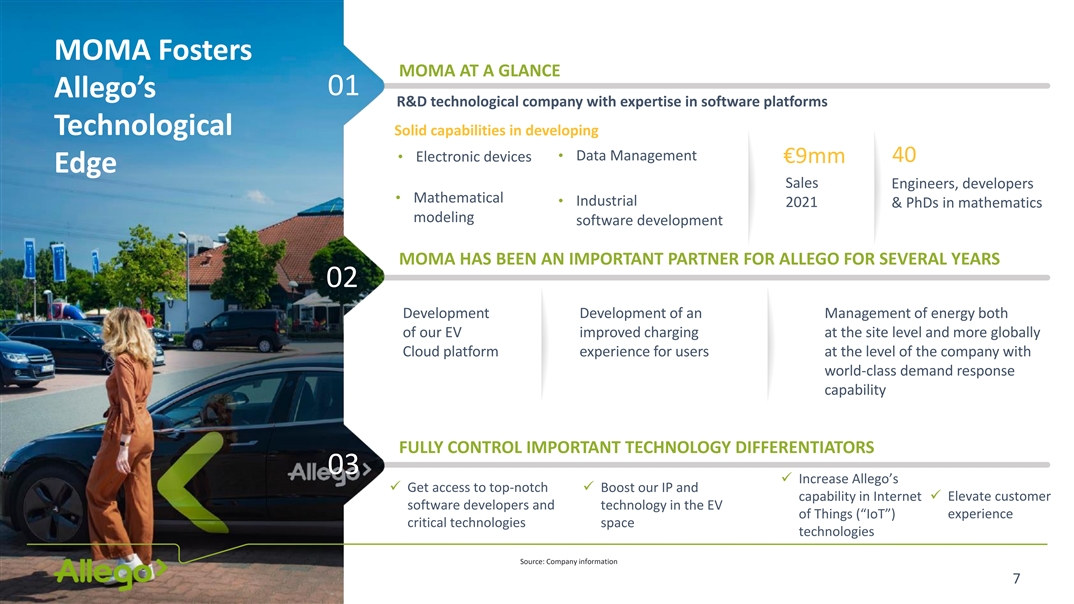 MOMA Fosters MOMA AT A GLANCE 01 Allego’s R&D technological company with expertise in software platforms Technological Solid capabilities in developing • Data Management • Electronic devices 40 €9mm Edge Sales Engineers, developers • Mathematical • Industrial 2021 & PhDs in mathematics modeling software development MOMA HAS BEEN AN IMPORTANT PARTNER FOR ALLEGO FOR SEVERAL YEARS 02 Development Development of an Management of energy both of our EV improved charging at the site level and more globally Cloud platform experience for users at the level of the company with world-class demand response capability FULLY CONTROL IMPORTANT TECHNOLOGY DIFFERENTIATORS 03 ✓ Increase Allego’s ✓ Get access to top-notch ✓ Boost our IP and capability in Internet ✓ Elevate customer software developers and technology in the EV of Things (“IoT”) experience critical technologies space technologies Source: Company information 7