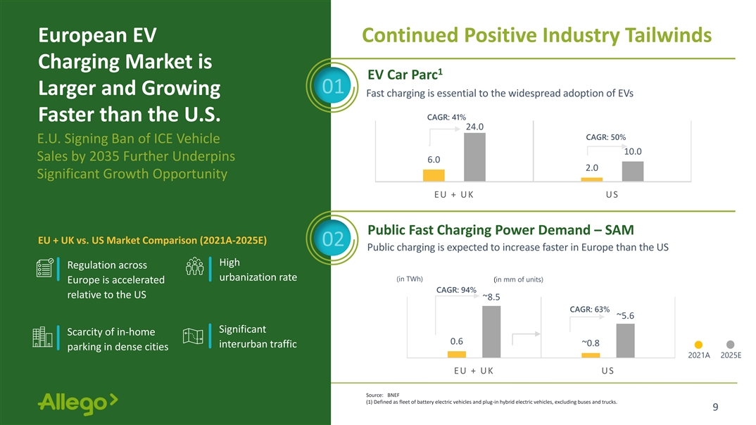 Allego’s Exercise of Mega-E Purchase Option Fast-Tracks its Strategic Focus MEGA-E OVERVIEW TRANSACTION OVERVIEW MEGA-E (Metropolitan In July 2022, Allego ~770 ports 01 02 Greater Areas Electrified) is exercised the purchase Enhances Allego’s strategic focus across the first large-scale Pan- option to acquire MEGA- on fast and ultra-fast chargers and 100+ sites European ultra-fast E assets to propel its the roll-out of its growth plans Allego initiative focusing strategic focus on fast- primarily fast and on corridors and-ultra-fast chargers. ultra-fast added Management commentary Scope of Mega-E Project: “I am very pleased to see the continued strength of our charging network as utilization rates increase, driven by expanding adoption of EVs throughout Europe, coupled with our strategic partnerships with OEMs, fleets, and premium retail locations, providing highly convenient access for consumers. The addition 12 ~322 350kW of Mega-E enhances Allego’s position in fast and ultra-fast chargers, and Ultra-fast Sites Countries 1 together with an 8.3% utilization and 99.5% up-time across our network, we chargers across EU provide a seamless experience for our customers.” -MATHIEU BONNET, CEO, ALLEGO Source: Company information (1) Includes Mega-E. 8