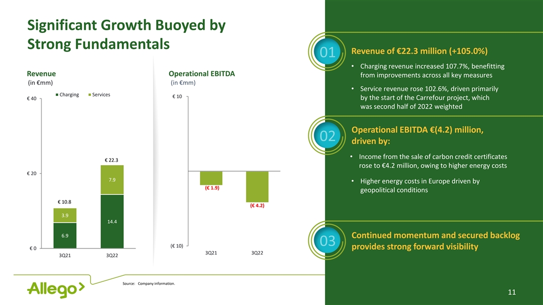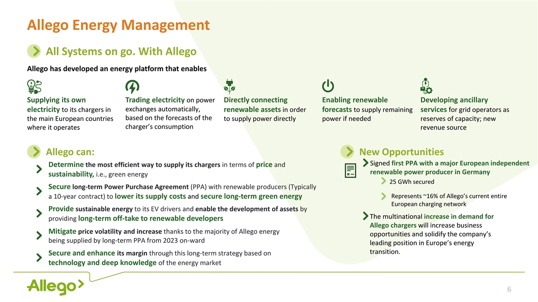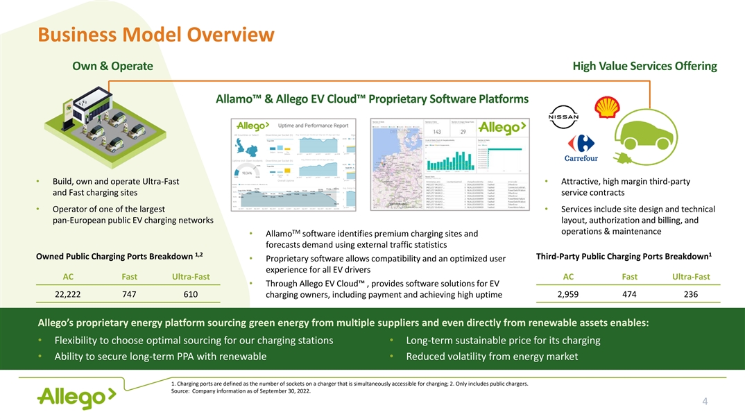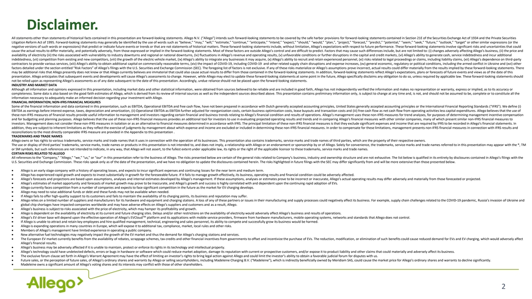 Disclaimer. All statements other than statements of historical facts contained in this presentation are forward-looking statements. Allego N.V. (“Allego”) intends such forward-looking statements to be covered by the safe harbor provisions for forward-looking statements contained in Section 21E of the Securities Exchange Act of 1934 and the Private Securities Litigation Reform Act of 1995. Forward-looking statements may generally be identified by the use of words such as “believe,” “may,” “will,” “estimate,” “continue,” “anticipate,” “intend,” “expect,” “should,” “would,” “plan,”, “project,” “forecast,” “predict,” “potential,” “seem,” “seek,” “future,” “outlook,” “target” or other similar expressions (or the negative versions of such words or expressions) that predict or indicate future events or trends or that are not statements of historical matters. These forward-looking statements include, without limitation, Allego’s expectations with respect to future performance. These forward-looking statements involve significant risks and uncertainties that could cause the actual results to differ materially, and potentially adversely, from those expressed or implied in the forward-looking statements. Most of these factors are outside Allego’s control and are difficult to predict. Factors that may cause such differences include, but are not limited to: (i) changes adversely affecting Allego’s business, (ii) the price and availability of electricity (iii) the risks associated with vulnerability to industry downturns and regional or national downturns, (iv) fluctuations in Allego’s revenue and operating results, (v) unfavorable conditions or further disruptions in the capital and credit markets, (vi) Allego’s ability to generate cash, service indebtedness and incur additional indebtedness, (vii) competition from existing and new competitors, (viii) the growth of the electric vehicle market, (ix) Allego’s ability to integrate any businesses it may acquire, (x) Allego’s ability to recruit and retain experienced personnel, (xi) risks related to legal proceedings or claims, including liability claims, (xii) Allego’s dependence on third-party contractors to provide various services, (xiii) Allego’s ability to obtain additional capital on commercially reasonable terms, (xiv) the impact of COVID-19, including COVID-19 and other related supply chain disruptions and expense increases, (xv) general economic, regulatory or political conditions, including the armed conflict in Ukraine and (xvi) other factors detailed under the section entitled “Risk Factors” of Allego’s filings with the U.S. Securities and Exchange Commission (SEC). The foregoing list of factors is not exclusive. If any of these risks materialize or Allego’s assumptions prove incorrect, actual results could differ materially from the results implied by these forward-looking statements. There may be additional risks that Allego presently does not know or that Allego currently believes are immaterial that could also cause actual results to differ from those contained in the forward-looking statements. In addition, forward-looking statements reflect Allego’s expectations, plans or forecasts of future events and views as of the date of this presentation. Allego anticipates that subsequent events and developments will cause Allego’s assessments to change. However, while Allego may elect to update these forward-looking statements at some point in the future, Allego specifically disclaims any obligation to do so, unless required by applicable law. These forward-looking statements should not be relied upon as representing Allego’s assessments as of any date subsequent to the date of this presentation. Accordingly, undue reliance should not be placed upon the forward-looking statements. INDUSTRY AND MARKET DATA Although all information and opinions expressed in this presentation, including market data and other statistical information, were obtained from sources believed to be reliable and are included in good faith, Allego has not independently verified the information and makes no representation or warranty, express or implied, as to its accuracy or completeness. Some data is also based on the good faith estimates of Allego, which is derived from its review of internal sources as well as the independent sources described above. This presentation contains preliminary information only, is subject to change at any time and, is not, and should not be assumed to be, complete or to constitute all the information necessary to adequately make an informed decision regarding your investment with Allego. FINANCIAL INFORMATION; NON-IFRS FINANCIAL MEASURES Some of the financial information and data contained in this presentation, such as EBITDA, Operational EBITDA and free cash flow, have not been prepared in accordance with Dutch generally accepted accounting principles, United States generally accepted accounting principles or the International Financial Reporting Standards (“IFRS”). We define (i) EBITDA as earnings before interest expense, taxes, depreciation and amortization, (ii) Operational EBITDA as EBITDA further adjusted for reorganization costs, certain business optimization costs, lease buyouts and transaction costs and (iii) free cash flow as net cash flow from operating activities less capital expenditures. Allego believes that the use of these non-IFRS measures of financial results provide useful information to management and investors regarding certain financial and business trends relating to Allego’s financial condition and results of operations. Allego’s management uses these non-IFRS measures for trend analyses, for purposes of determining management incentive compensation and for budgeting and planning purposes. Allego believes that the use of these non-IFRS financial measures provides an additional tool for investors to