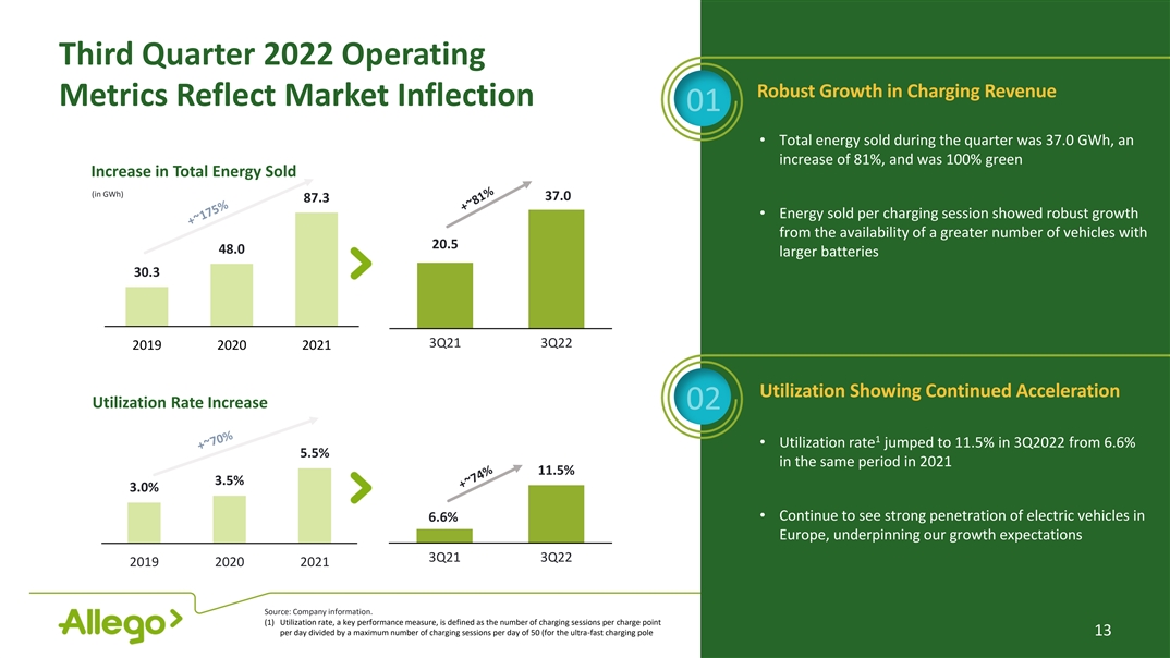Increasing Demand and Charging Sessions Increasing with Elevated Visibility Higher Density of EVs 1 • Allego’s network handled 2.2 million total charging sessions in the three months ended Total Number of Charging Sessions September 30, 2022 through its EV Cloud platform (in mm) (+37% as compared to the same period in 2021) 6.1 2.2 1.6 • Allego’s network continues to experience strong 3.7 3.0 customer loyalty with an approximately 77% 3 recurring rate in 3Q2022 1.7 2018 2019 2020 2021 3Q21 3Q22 2 User Track Record on Allego’s Network Development of Smart Charging Capacity (in % recurring users) 78% 77% provides opportunities for ancillary services 82% 80% 79% • Connect to renewal sources to supply “green energy” to its chargers • Develop ancillary services for grid operators as reserve capacity • Allow selling excess capacity in the open market 2019 2020 2021 3Q21 3Q22 Source: Company information. (1) Total number of charging sessions for both company-owned and third-party sites (2) BNEF, August 18, 2022 12 (3) All customer data is tracked through the ID cards/tokens used on Allego’s network and required for invoicing