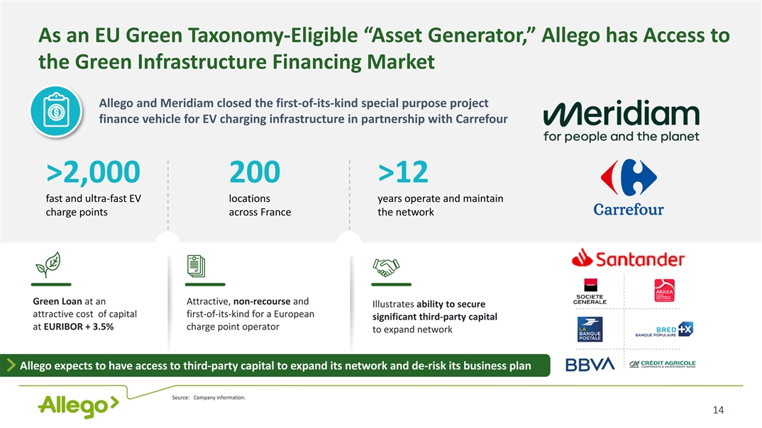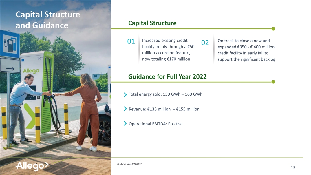 As an EU Green Taxonomy-Eligible “Asset Generator,” Allego has Access to the Green Infrastructure Financing Market Allego and Meridiam closed the first-of-its-kind special purpose project finance vehicle for EV charging infrastructure in partnership with Carrefour >2,000 200 >12 fast and ultra-fast EV locations years operate and maintain charge points across France the network Green Loan at an Attractive, non-recourse and Illustrates ability to secure attractive cost of capital first-of-its-kind for a European significant third-party capital at EURIBOR + 3.5% charge point operator to expand network Allego expects to have access to third-party capital to expand its network and de-risk its business plan Source: Company information. 14
