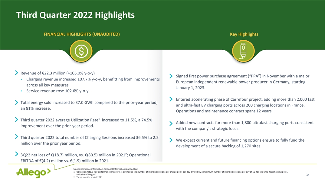 Business Model Overview Own & Operate High Value Services Offering Allamo™ & Allego EV Cloud™ Proprietary Software Platforms • Build, own and operate Ultra-Fast • Attractive, high margin third-party and Fast charging sites service contracts • Operator of one of the largest • Services include site design and technical pan-European public EV charging networks layout, authorization and billing, and TM operations & maintenance • Allamo software identifies premium charging sites and forecasts demand using external traffic statistics 1,2 1 Owned Public Charging Ports Breakdown Third-Party Public Charging Ports Breakdown • Proprietary software allows compatibility and an optimized user experience for all EV drivers AC Fast Ultra-Fast AC Fast Ultra-Fast • Through Allego EV Cloud™ , provides software solutions for EV 22,222 747 610 2,959 474 236 charging owners, including payment and achieving high uptime Allego’s proprietary energy platform sourcing green energy from multiple suppliers and even directly from renewable assets enables: • Flexibility to choose optimal sourcing for our charging stations• Long-term sustainable price for its charging • Ability to secure long-term PPA with renewable• Reduced volatility from energy market 1. Charging ports are defined as the number of sockets on a charger that is simultaneously accessible for charging; 2. Only includes public chargers. Source: Company information as of September 30, 2022. 4