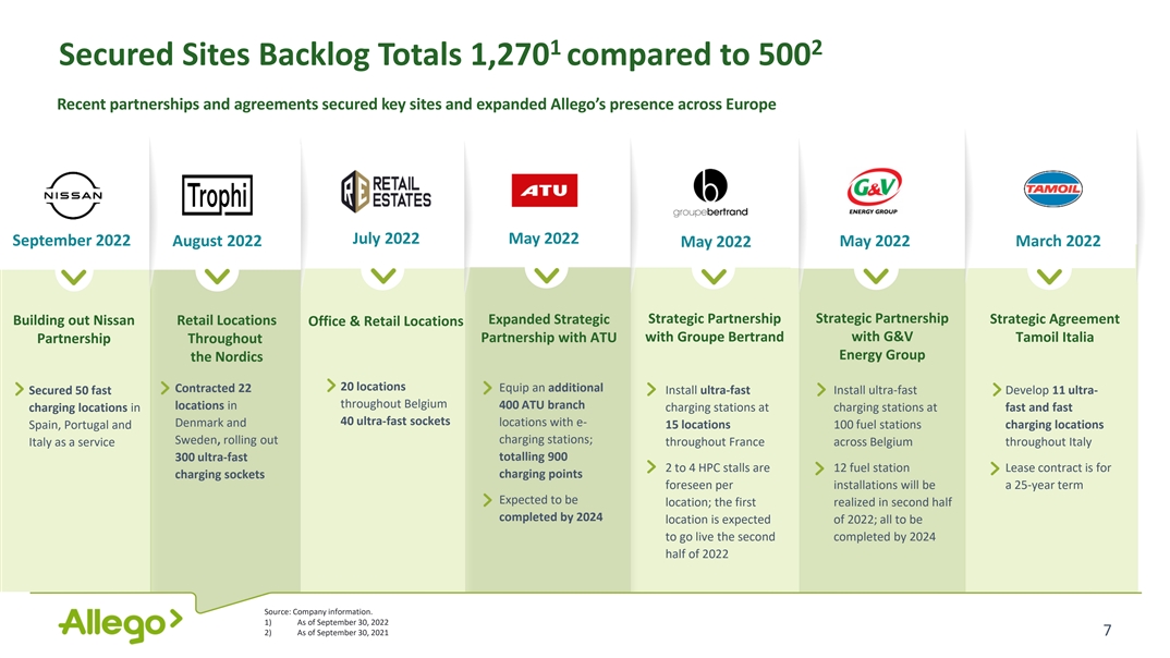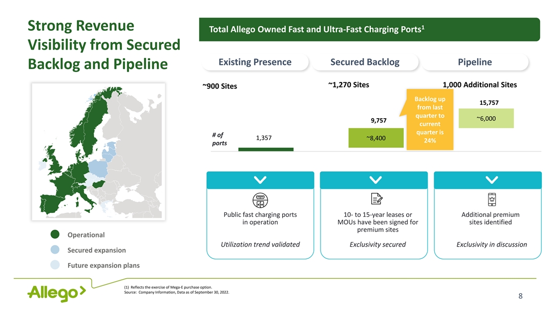 1 2 Secured Sites Backlog Totals 1,270 compared to 500 Recent partnerships and agreements secured key sites and expanded Allego’s presence across Europe July 2022 May 2022 September 2022 August 2022 May 2022 May 2022 March 2022 Strategic Partnership Strategic Partnership Expanded Strategic Strategic Agreement Building out Nissan Retail Locations Office & Retail Locations with Groupe Bertrand with G&V Tamoil Italia Partnership Throughout Partnership with ATU Energy Group the Nordics 20 locations Contracted 22 Equip an additional Install ultra-fast Install ultra-fast Develop 11 ultra- Secured 50 fast throughout Belgium locations in 400 ATU branch charging locations in charging stations at charging stations at fast and fast 40 ultra-fast sockets locations with e- Denmark and Spain, Portugal and 15 locations 100 fuel stations charging locations charging stations; Sweden, rolling out Italy as a service throughout France across Belgium throughout Italy 300 ultra-fast totalling 900 2 to 4 HPC stalls are 12 fuel station Lease contract is for charging sockets charging points foreseen per installations will be a 25-year term Expected to be location; the first realized in second half completed by 2024 location is expected of 2022; all to be to go live the second completed by 2024 half of 2022 Source: Company information. 1) As of September 30, 2022 2) As of September 30, 2021 7