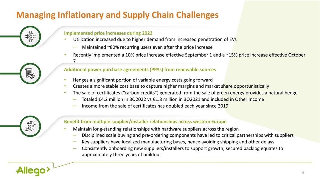 1 Strong Revenue Total Allego Owned Fast and Ultra-Fast Charging Ports Visibility from Secured Existing Presence Secured Backlog Pipeline Backlog and Pipeline ~1,270 Sites 1,000 Additional Sites ~900 Sites Backlog up 15,757 from last quarter to ~6,000 9,757 current quarter is # of 1,357 ~8,400 24% ports Public fast charging ports 10- to 15-year leases or Additional premium in operation MOUs have been signed for sites identified premium sites Operational Utilization trend validated Exclusivity secured Exclusivity in discussion Secured expansion Future expansion plans (1) Reflects the exercise of Mega-E purchase option. Source: Company Information, Data as of September 30, 2022. 8